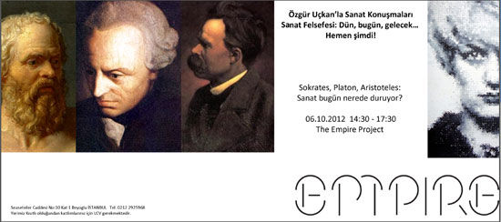 The Empire Project’te Özgür Uçkan’la sanat konuşmaları 6 Ekim’den itibaren galeri oditoryumunda başlıyor. İki haftada bir Cumartesi günleri gerçekleşecek olan Sanat Felsefesi konuşmalarının ilk bölümü Sokrates , Platon ve Aristoteles’in önermelerinin günümüze uzanan izdüşümlerini inceliyor. Özgür Uçkan'la Sanat Felsefesi konuşmaları 14:30 ile17:30 saatleri arasında The Empire Project’in oditoryumunda gerçekleşecek olup, ilgili olan herkese açıktır. Konuyla ilgili programı ve konu başlıklarının detaylarını ekte bulabilirsiniz. Kontenjanımız kısıtlı olduğundan LCV verilmesini rica ederiz.